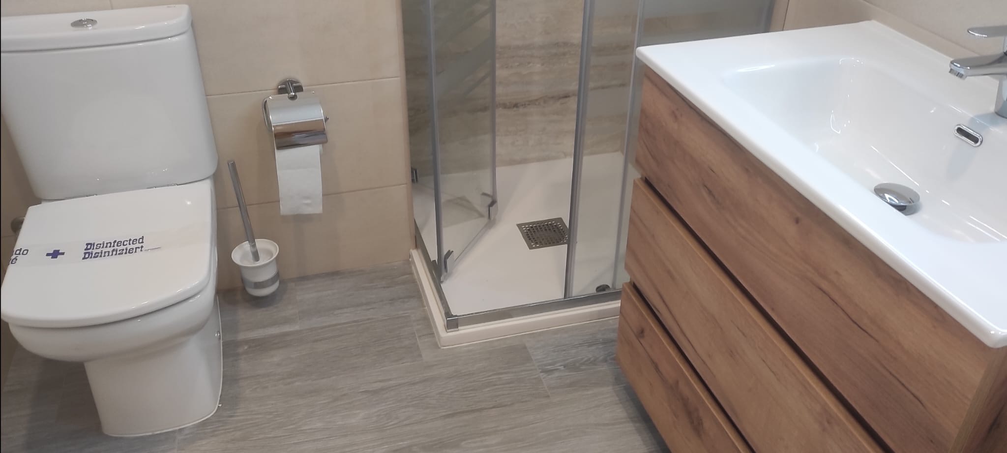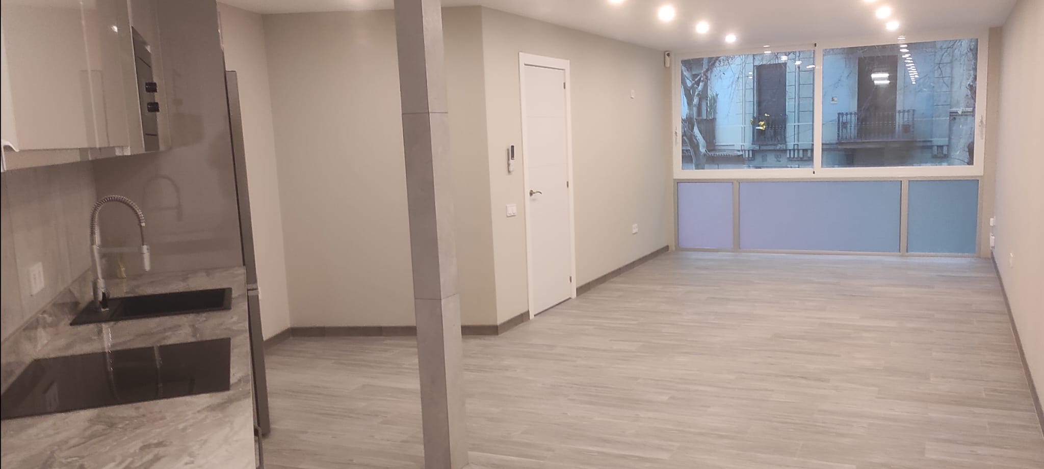 La reforma se ha realizado con acabados modernos y materiales de calidad, destacando el suelo de parquet que aporta calidez al conjunto y la carpintería de aluminio que mejora el aislamiento.